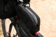 3. Install the head tube strap as the 3rd mount for the bag, which works to keep the bag snug against the head tube and eliminates all swaying and rocking of the bag. Go back and tighten the top tube straps and check that all straps are tight and ready for action. Excess webbing should be tucked into the preinstalled elastic loops on the top tube straps.
