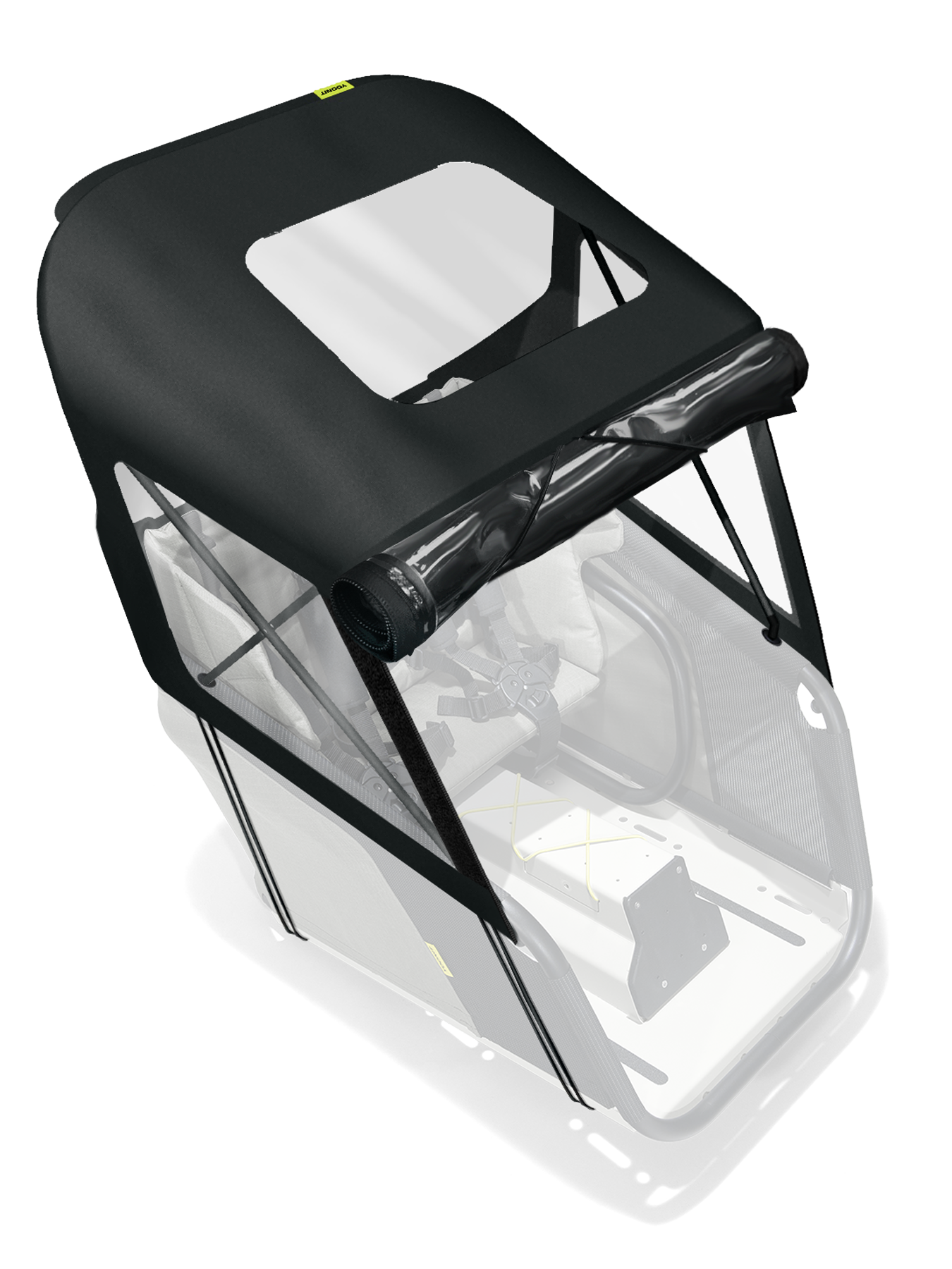 The weatherproof canopy for the Family Up Carrier ensures that kids are well protected in wind and rain. The front entry with roll-up function allows easy access.