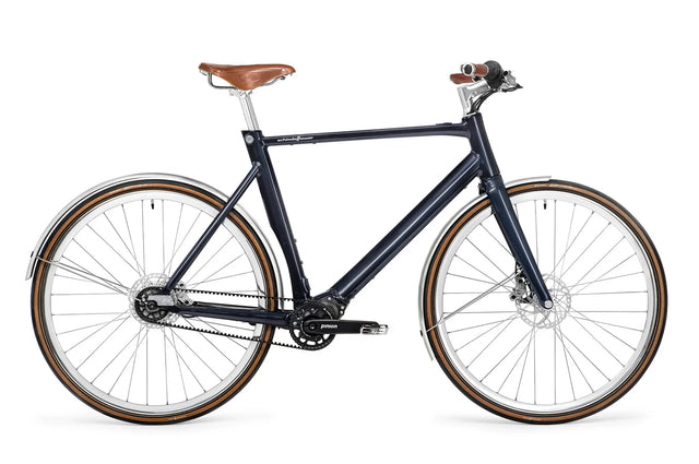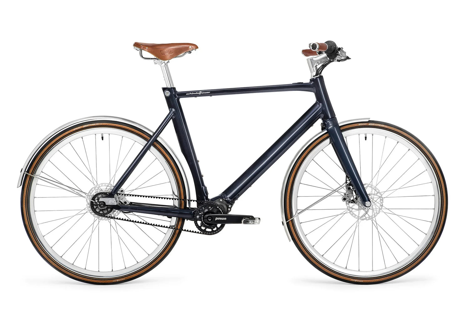 Like his single speed brother, Arthur VI/IX embodies the characteristic Schindelhauer design DNA of clear, aero-influenced shapes and sportive geometry. You can't see the electric drive on its slim exterior, but with every pedal movement you feel the additional boost. Combined with the Pinion gearbox integrated directly into the frame, you feel even more comfortable on the road and climbs are a breeze. You are also well prepared for darkness and wet conditions thanks to the StVZO-compliant lighting system and mudguards.