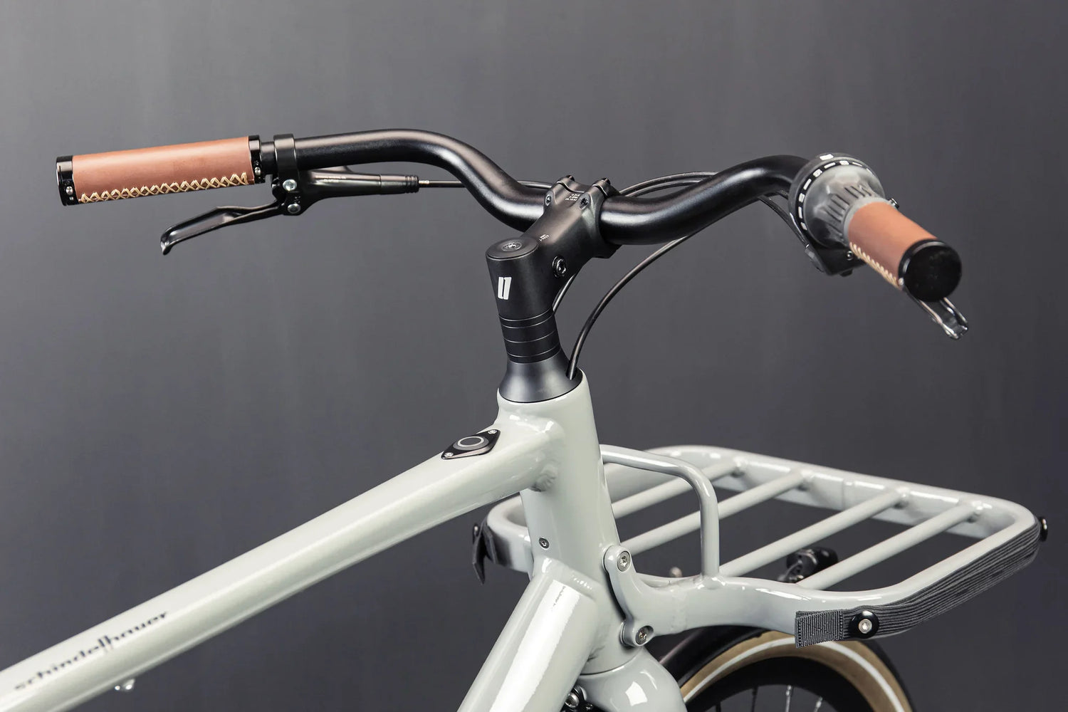 Consistent with practicability and design. The newly developed Schindelhauer frame geometry with longer head tube and shorter stem ensures a comfortable riding position with Emil. Even cobblestone paths become a new favourite shortcut with the large-volume tyres. Larger loads can be transported safely with the frame-mounted front rack and clever tensioning strap system.