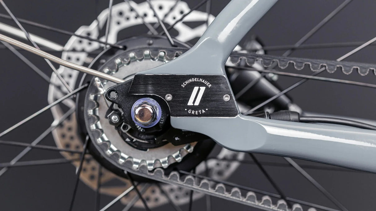 The patented Belt Port, an almost invisible opening at the dropout, makes it possible to change the belt drive. The carriage tensioning system is used for optimal adjustment of the belt tension.
