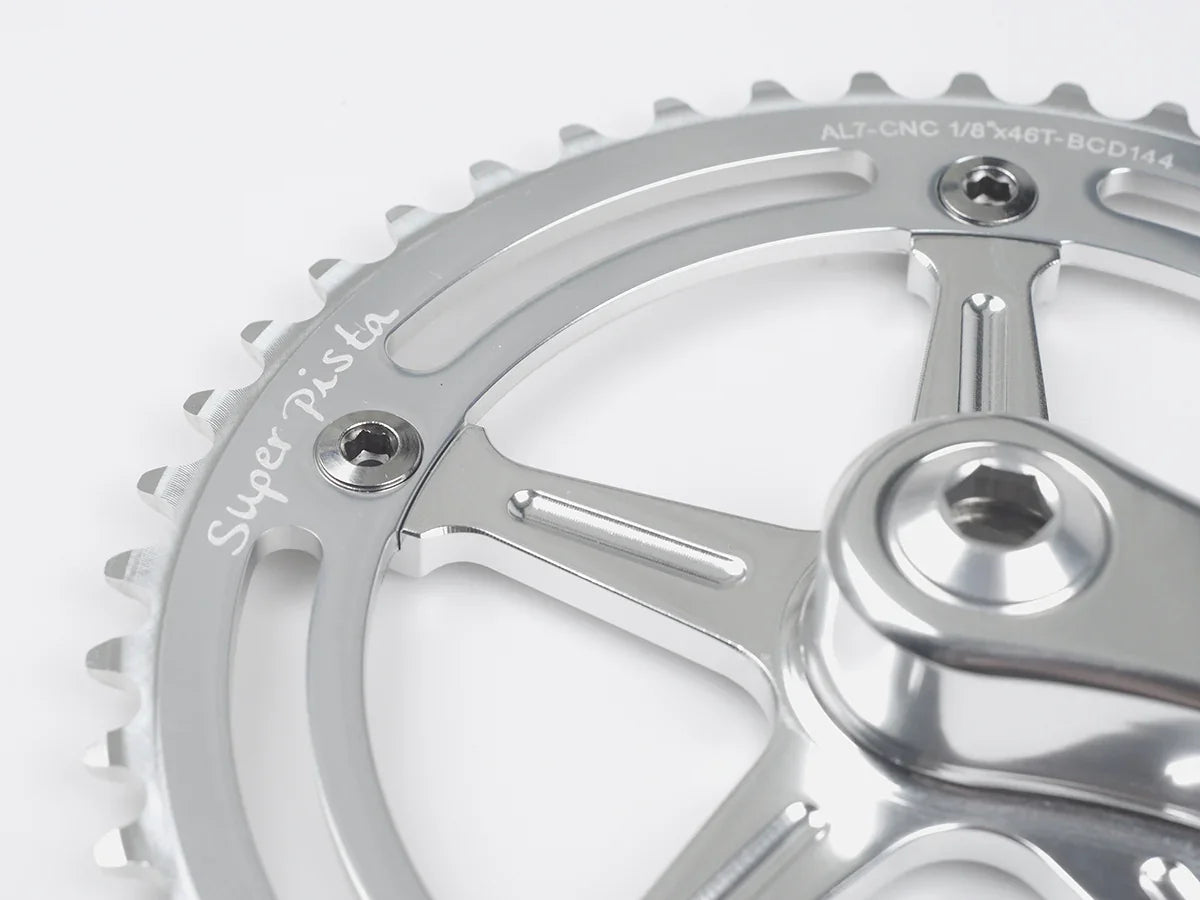 The Chainring shares the same 144BCD as many other top end track chainsets as well as old school Campagnolo Pista cranks.