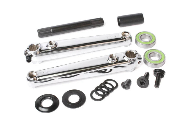 The Saker Cranks are designed to be an affordable 3-pc crank with tubular chromoly arms that have a single pinch bolt design. It uses a 19mm chromoly spindle with 8 splines. The cranks include a 19mm Mid BB with spacers. RHD/LHD compatible. Comes in black or chrome.