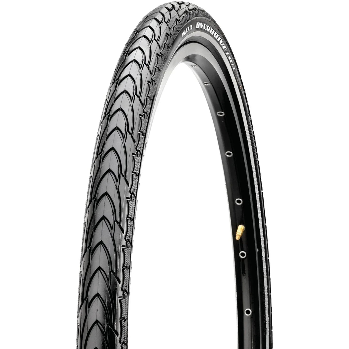 The Maxxis Overdrive has everything you expect from a modern City and Trekking tire and also surprises with innovative extras. The high-quality carcass with 60 TPI is not only protected as usual under the tread, but also all around the sidewalls with a robust SilkShield. The very durable rubber compound in the center of the tread convinces with low rolling resistance and is complemented on the sides by a grippy compound that provides best cornering grip even in wet conditions. Reflective stripes on the sidewalls increase safety in poor visibility. With its high stability at low weight, the Overdrive Excel is also very suitable for e-Bikes with support up to 25 km/h.