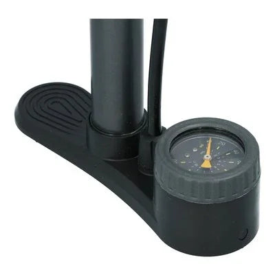 The Dresco bicycle pump with manometer. The pump tube has a double pump head with which all types of bicycle valves (Dunlop, Presta and Schrader) can be pumped. The hose has a length of approximately 65cm. The floor pump can pump up to a pressure of 11 Bar or 160 PSI. The bicycle pump has two adapter nipples for inflating airbeds or inflatable toys and a nipple for inflating a football.