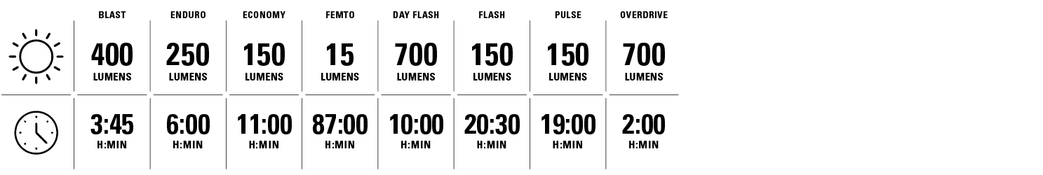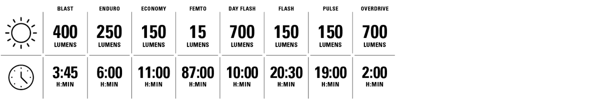 | Enduro-Modus: | 250/06:00 Lumen / hh:mm |