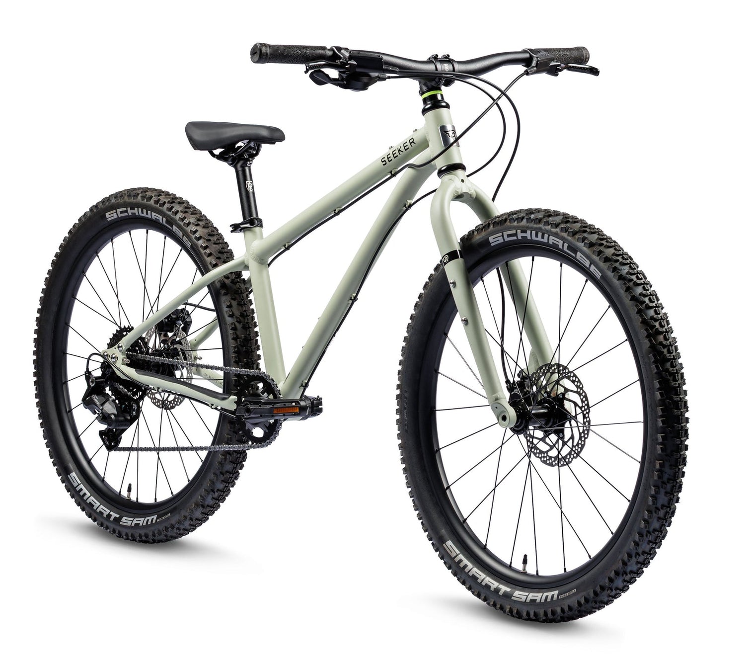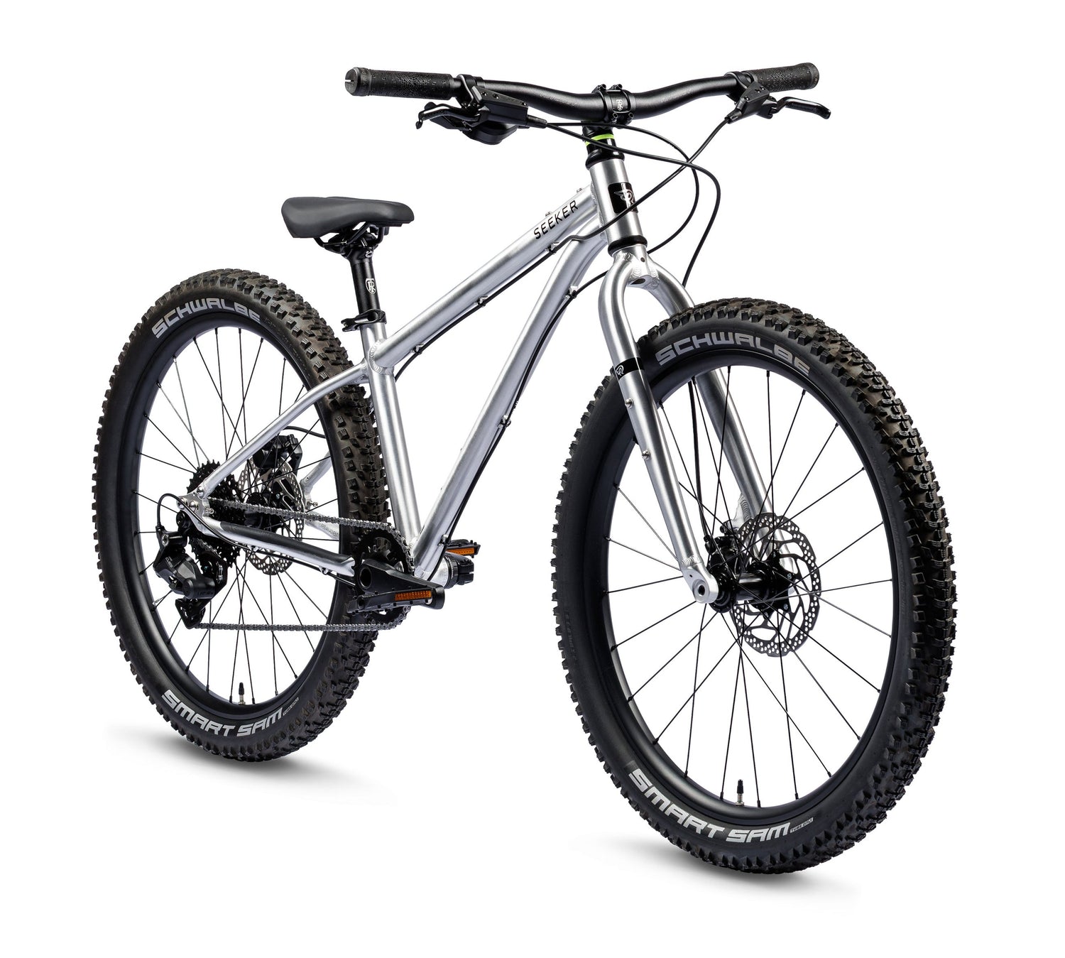 Built to handle off-road adventures with ease and a confident ride on varied terrain. The Seeker 24 comes equipped with a Shimano CUES 1x9 drivetrain with a light-action thumb shifter ensures smooth, responsive shifting, while the 130mm crankarms offer efficient pedalling. Setup with powerful Tektro hydraulic disc brakes, sealed bearing wheels with bolt-thru axles and Schwalbe Smart Sam 2.3" tires, this bike is ready for anything from light trails to full on off-road adventures.