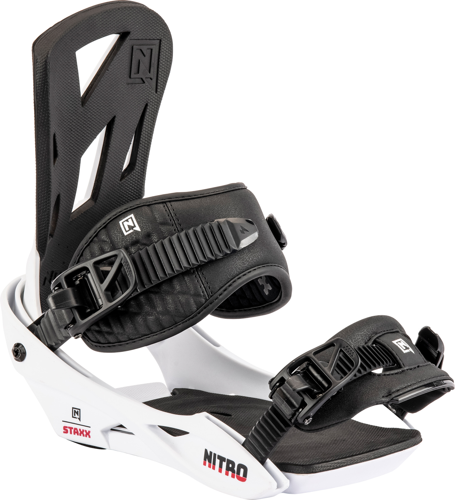 De Nitro Staxx is Nitro's instapmodel binding. Hij heeft een volledig gevoerde basisplaat (EVA demping) en een asymmetrische hoge achterkant. De hoge achterkant biedt goede ondersteuning en comfort. De BESTE Teenband laat je kiezen of je de band over je tenen of je voet wilt laten lopen. De enkelband is gevoerd om comfortabel om je enkel te sluiten. Hoewel Staxx is ontworpen voor beginners tot gemiddelde rijders, hebben zelfs snowboardprofs zoals Elias Elhard Staxx als favoriete binding ervaren.