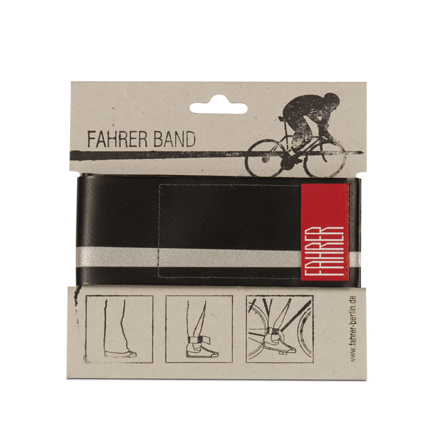 The individual TAPE for cycling. Its purpose: to prevent conflicts between the trouser leg and the bicycle. The chain is always stronger, and at best, only oil traces remain to show who has won the battle. The family is enormous, and each member is unique. In the dark, they all reflect light — ideal for a long and busy life on the street. Features: - limited edition - material: recycled truck tarpaulin / boat cover / advertising banner - length 47 cm, width 5 cm - designed and handmade in Berlin.