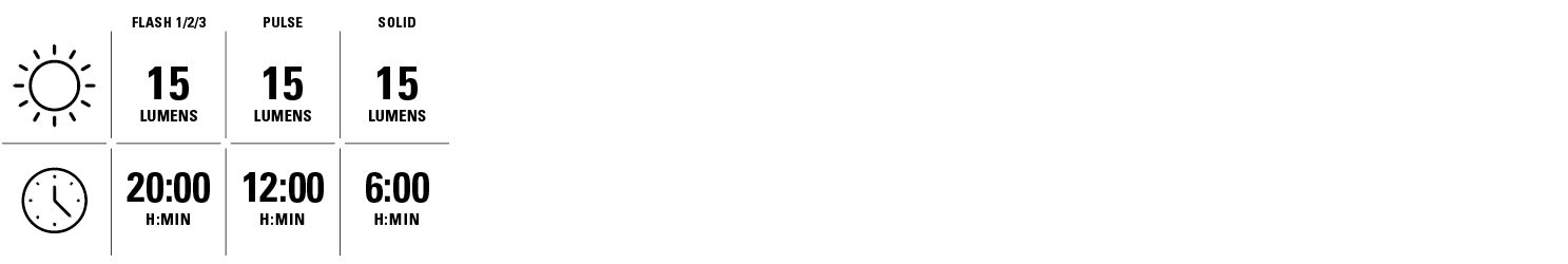 | Flash Mode 1/2/3: | 5/15:00 Lumen / hh:mm |