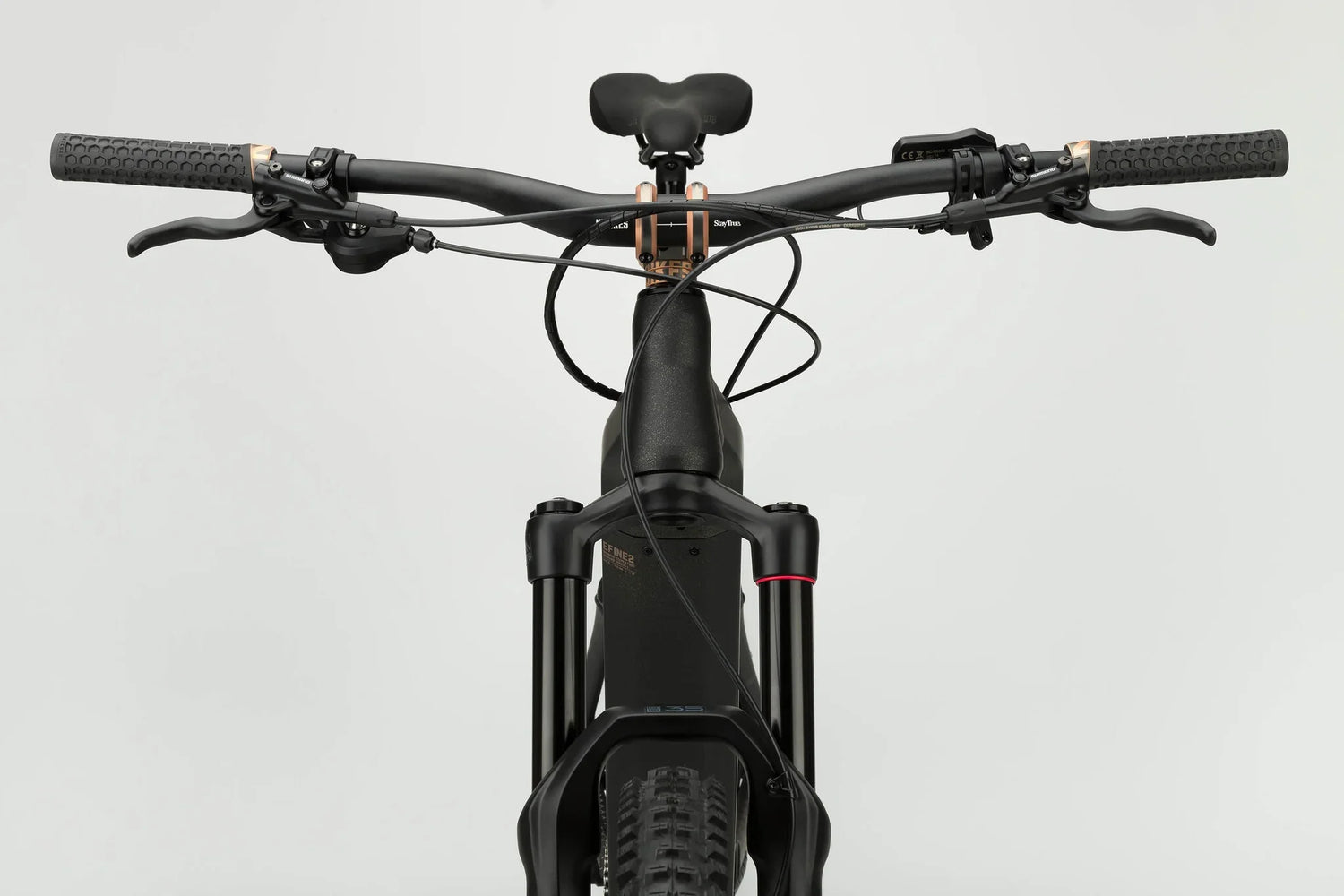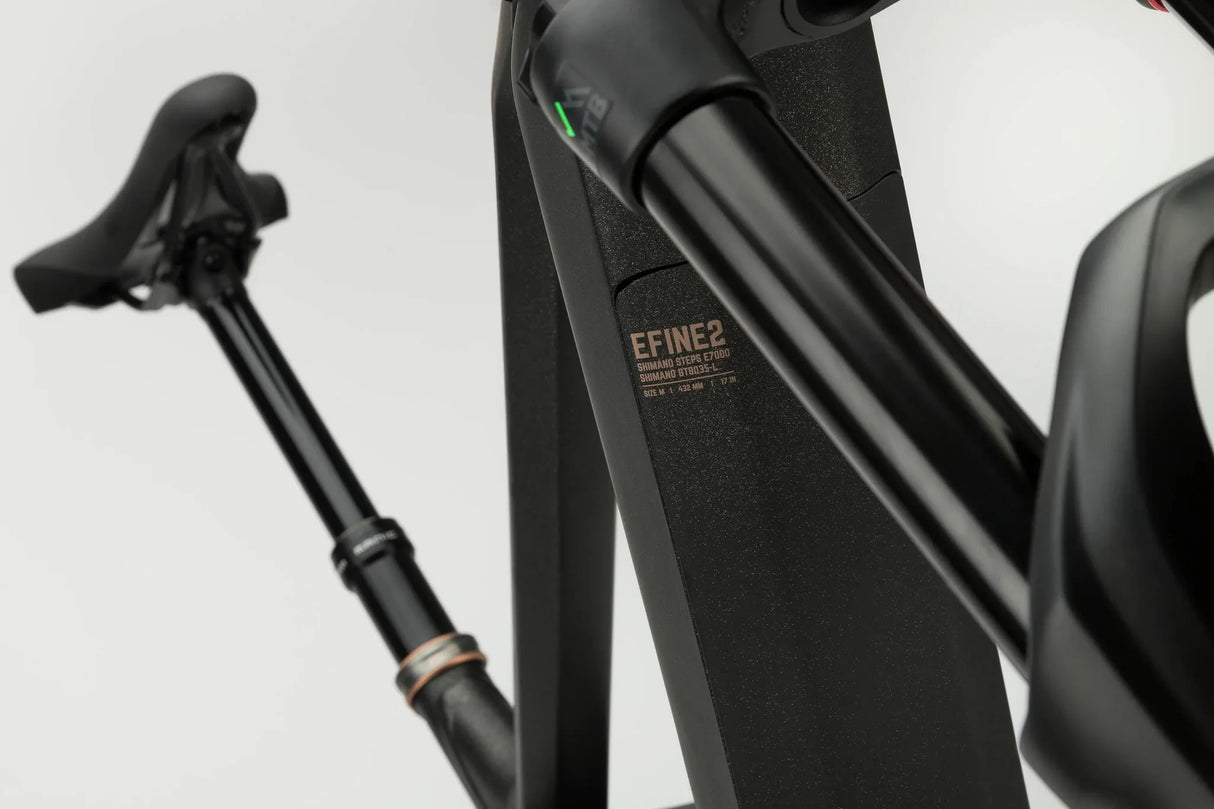 OUR TEAM DISLIKES WIMPY RIDES, SO WE DESIGNED THE E-FINE AS A ROBUST MACHINE WITH A SRAM 35 GOLD RL FORK, COIL SHOCK, AND AGGRESSIVE TIRES. ADJUSTABLE BB HEIGHT ENSURES EVERYONE FINDS THEIR PERFECT RIDING POSITION.